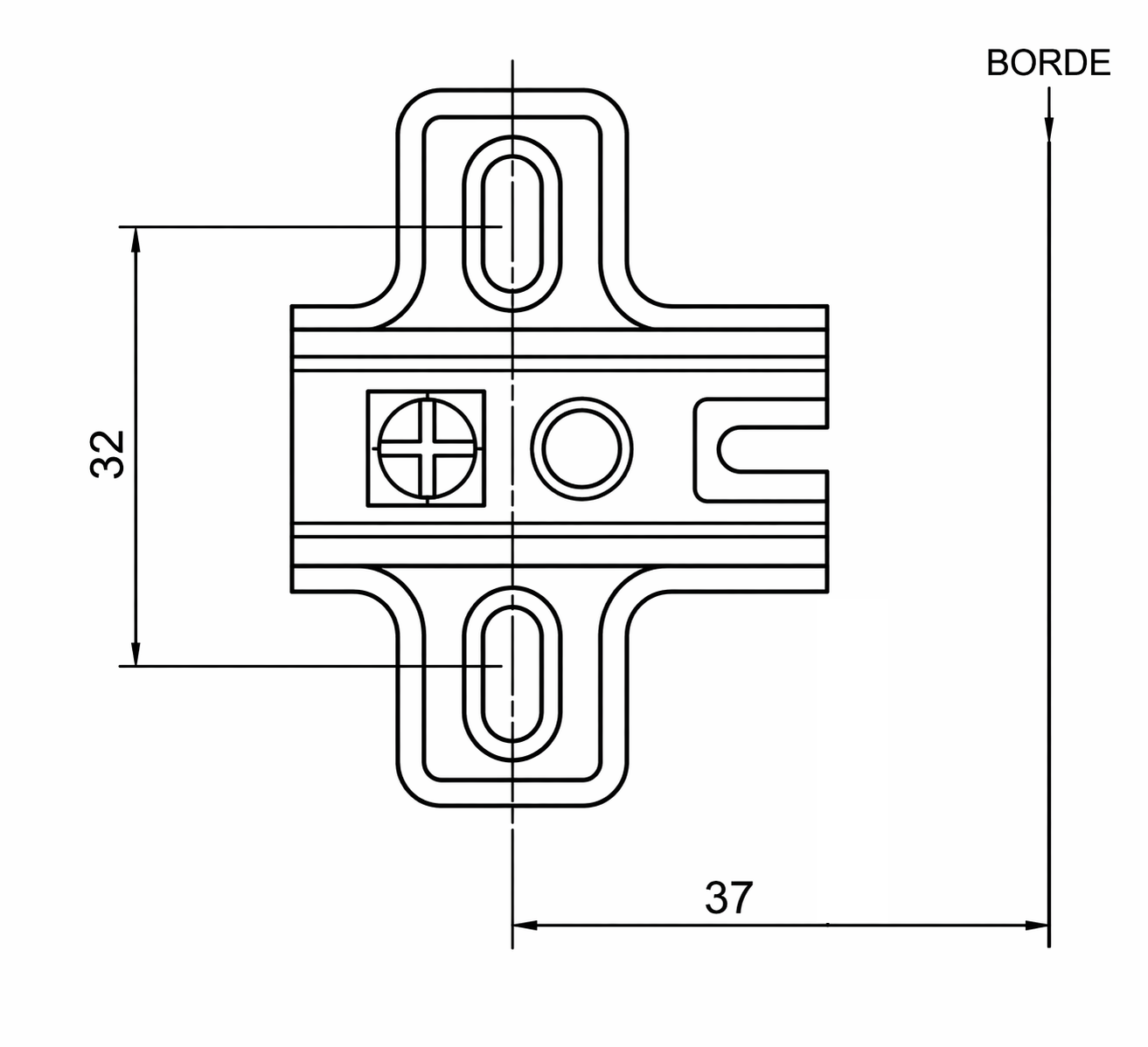Base para bisagra de cazoleta 35 mm, fabricada en acero de alta resistencia, diseñada para la fijación segura de bisagras en sistemas de mobiliario.