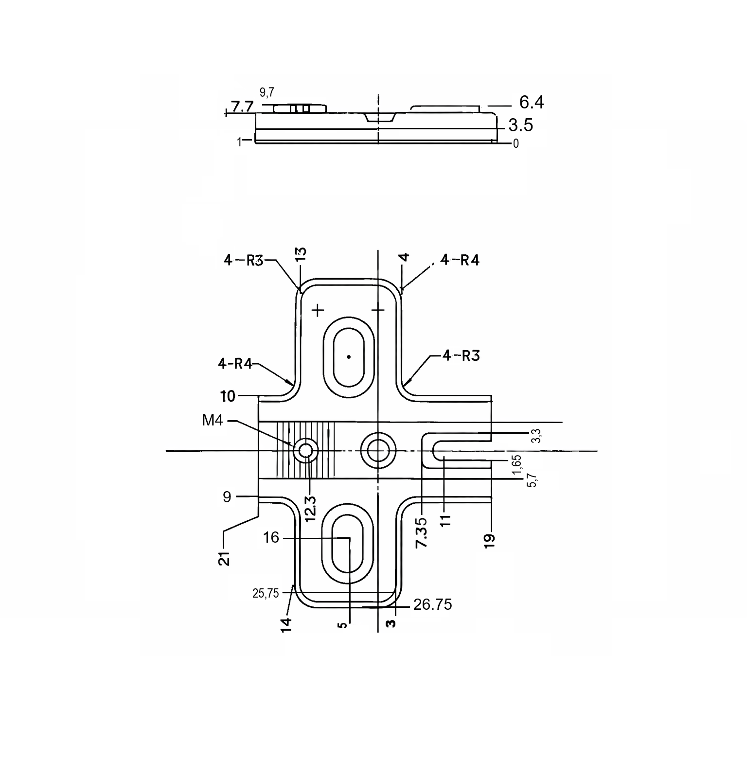 Base para bisagra mini fabricada en acero de alta resistencia, diseñada para la fijación de bisagras en sistemas de mobiliario compacto.