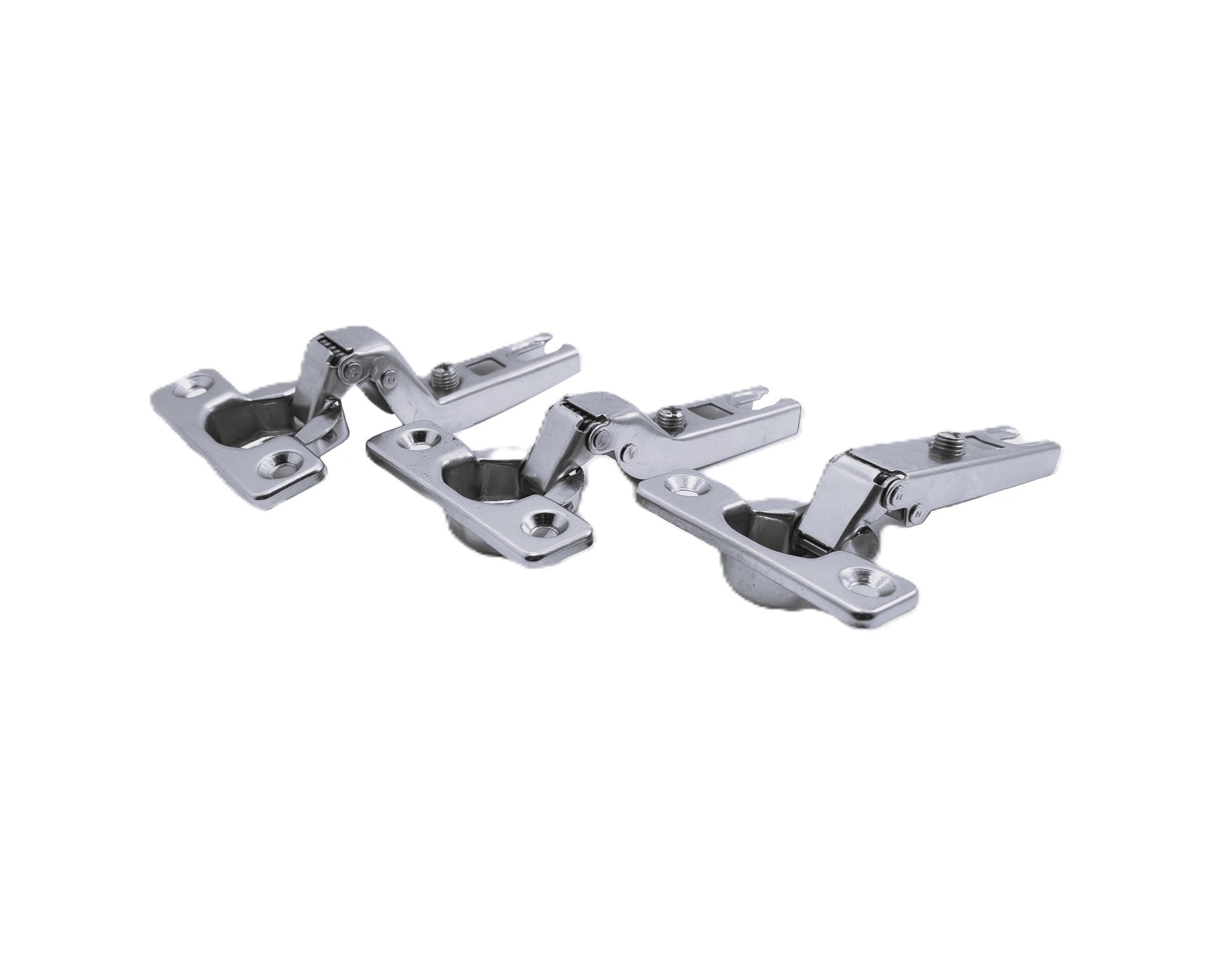 Bisagras mini recta, acodada y super acodada, ideales para distintas configuraciones de puertas en muebles compactos.